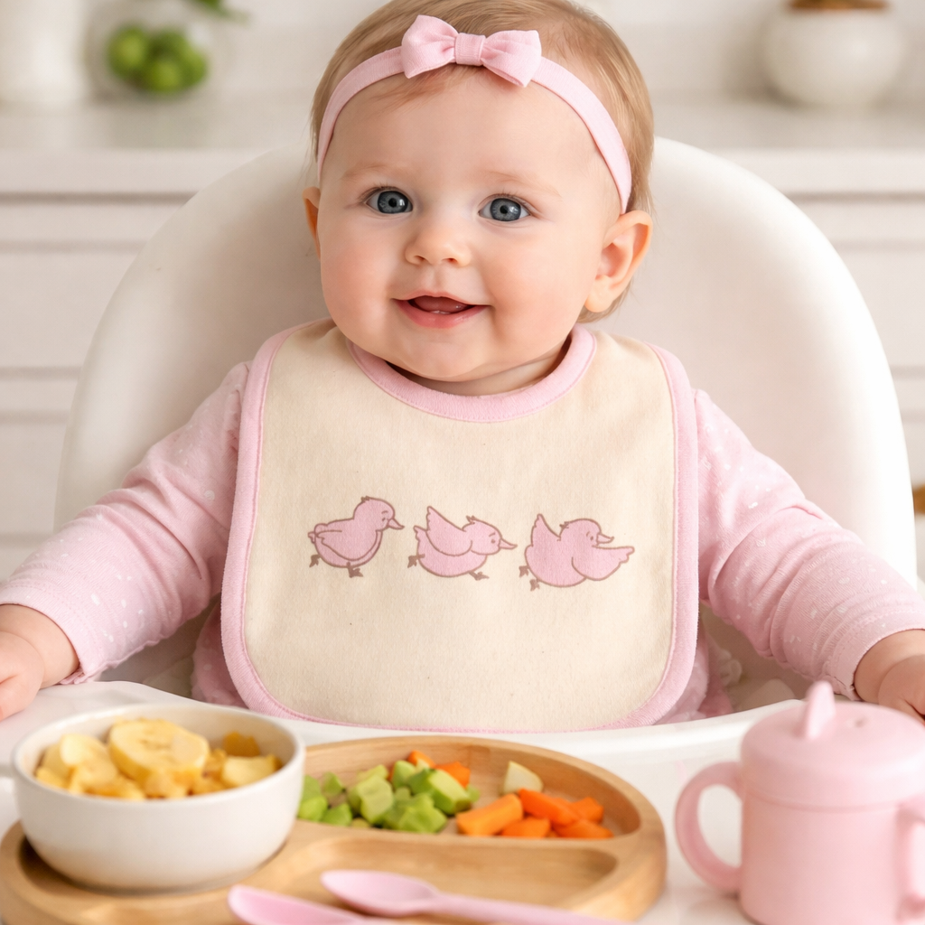 Natural Organic Sherpa which feels soft and plush in our lavender stripe trim. This is a larger bib.